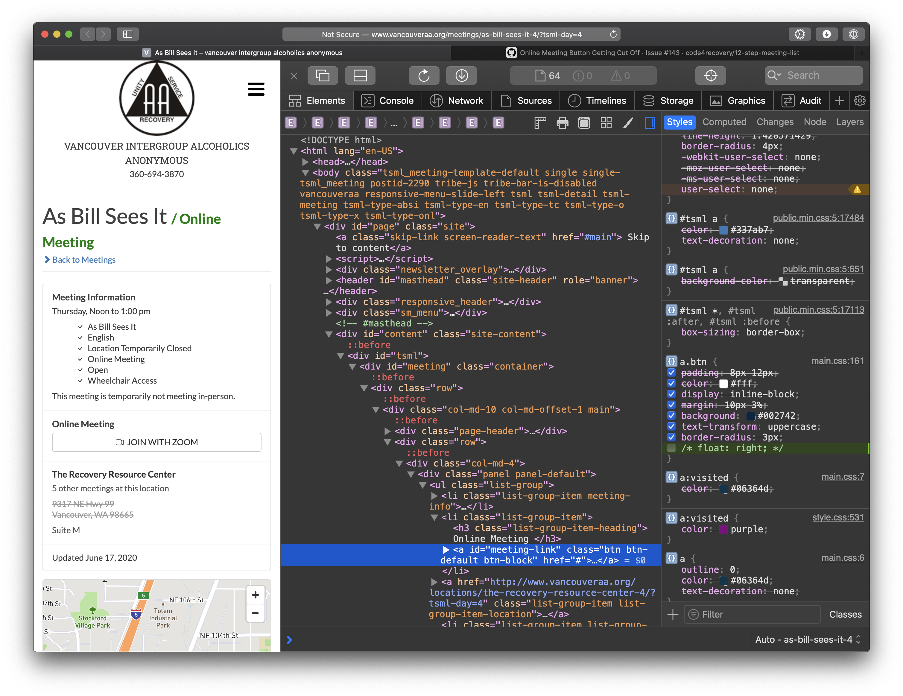TSML v3.11 has a UI issue with online meetings and how addresses (either specific or approximate) are displayed on a single meeting page.
