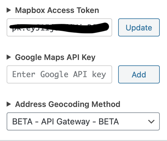 MapBox token for mapping (or you can continue to use your own Google mapping key if you prefer). Legacy for geocoding (or you can use the Beta, but it will be replaced in the (not too distant, perhaps) future).