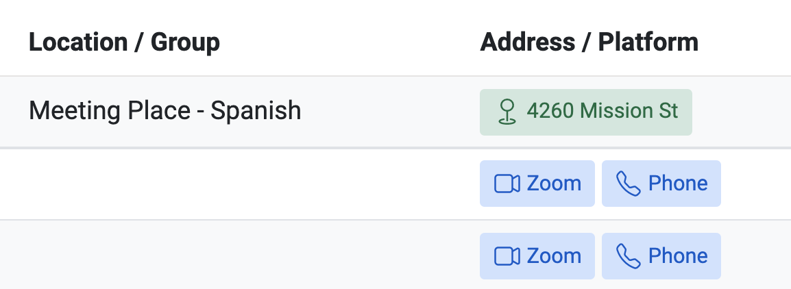 To achieve this (interpret the 12 step group as a virtual "location") springs to mind. This example shared by another team seems close - Im not entirely sure how this has been achieved. https://aasanjose.org/meetings?type=online&meeting=big-book-study